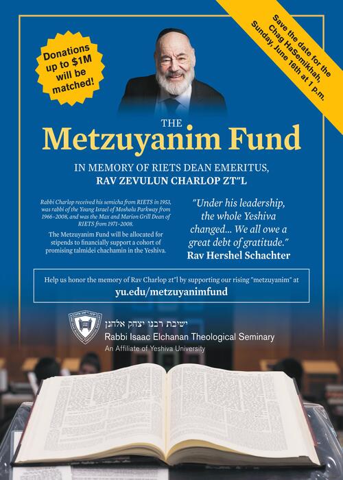 Our Dean Emeritus, Rabbi Zevulun Charlop Zt"l, was a pillar of the RIETS community for decades and aided countless talmidim (or, as he would say, "metzuyanim") on their path to becoming rabbanim. As we prepare to celebrate the Chag HaSemikhah, we are privileged to establish the Metzuyanim Fund in his memory to financially support a yearly cohort of promising talmidei chachamim learning in our kollel. Thanks to a generous donor, contributions will be matched up to $1 million! Please consider supporting our rising metzuyanim in order to continue the tradition of excellence and success in learning that Rabbi Charlop embodied. Donations can be made at https://es.3ojfh.shop/MetzuyanimFund
